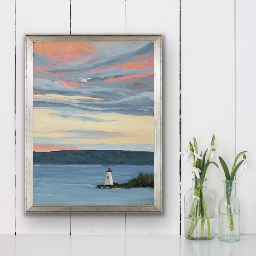 Baddeck Skies is a 9″x12″x 1/8″ acrylic painting on masonite board. A timeless Maritime moment captured at sunset of the well loved lighthouse in Baddeck on Cape Breton Island.